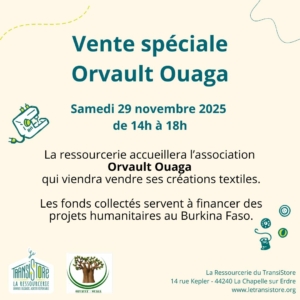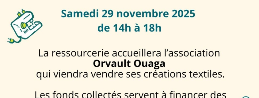 Le 29 novembre, de 14h à 18h, la ressourcerie accueillera l’association Orvault Ouaga, pour une vente spéciale de leurs créations textiles.