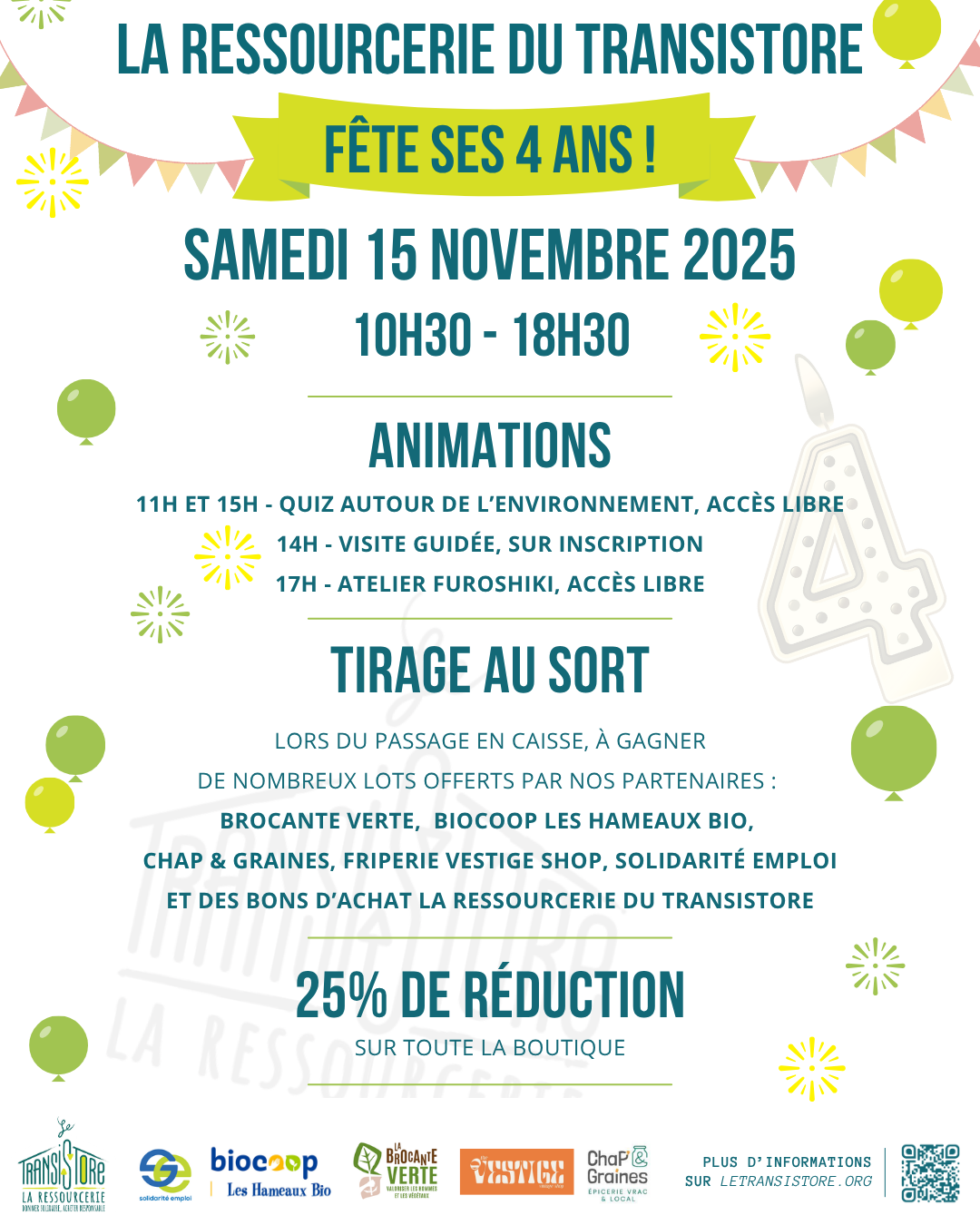 la Ressourcerie du TransiStore 14 Rue Kepler, La Chapelle Sur Erdre, FranceLa ressourcerie du TransiStore fêtes ses 4 ans !! N'hésitez pas à passer en boutique pour fêter ça avec nous. 11h et 15h - Quizz autour du réemploi et de […]