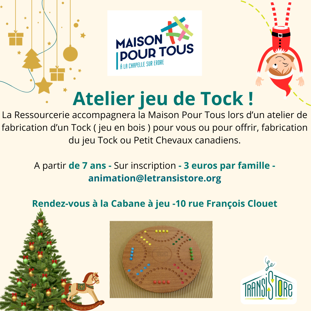 La Ressourcerie accompagnera la Maison Pour Tous lors d’un atelier de fabrication d’un Tock ( jeu en bois ) pour vous ou pour offrir, fabrication du jeu Tock ou Petit Chevaux canadiens. A partir de 7 ans - Sur inscription - 3 euros par famille - animation@letransistore.org Rendez-vous à la Cabane à jeu -10 rue […]